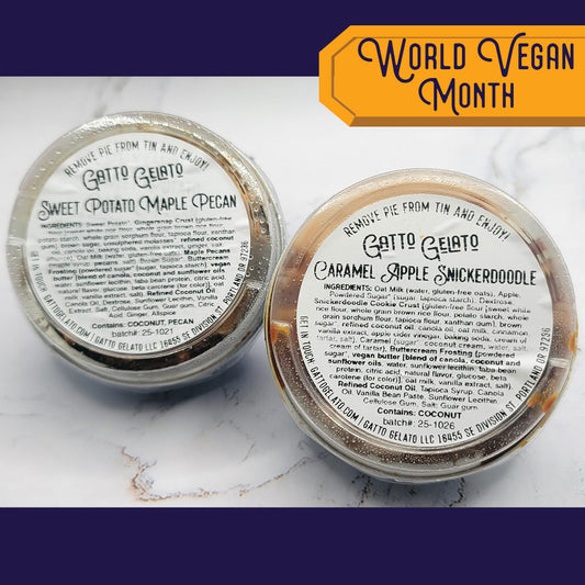 try our sweet potato maple pecan or caramel apple snickerdoodle gelato mini-pies and get a stamp for each purchase to increase your odds of winning the World Vegan Month grand prize of a $25 gift card towards each participating restaurant!