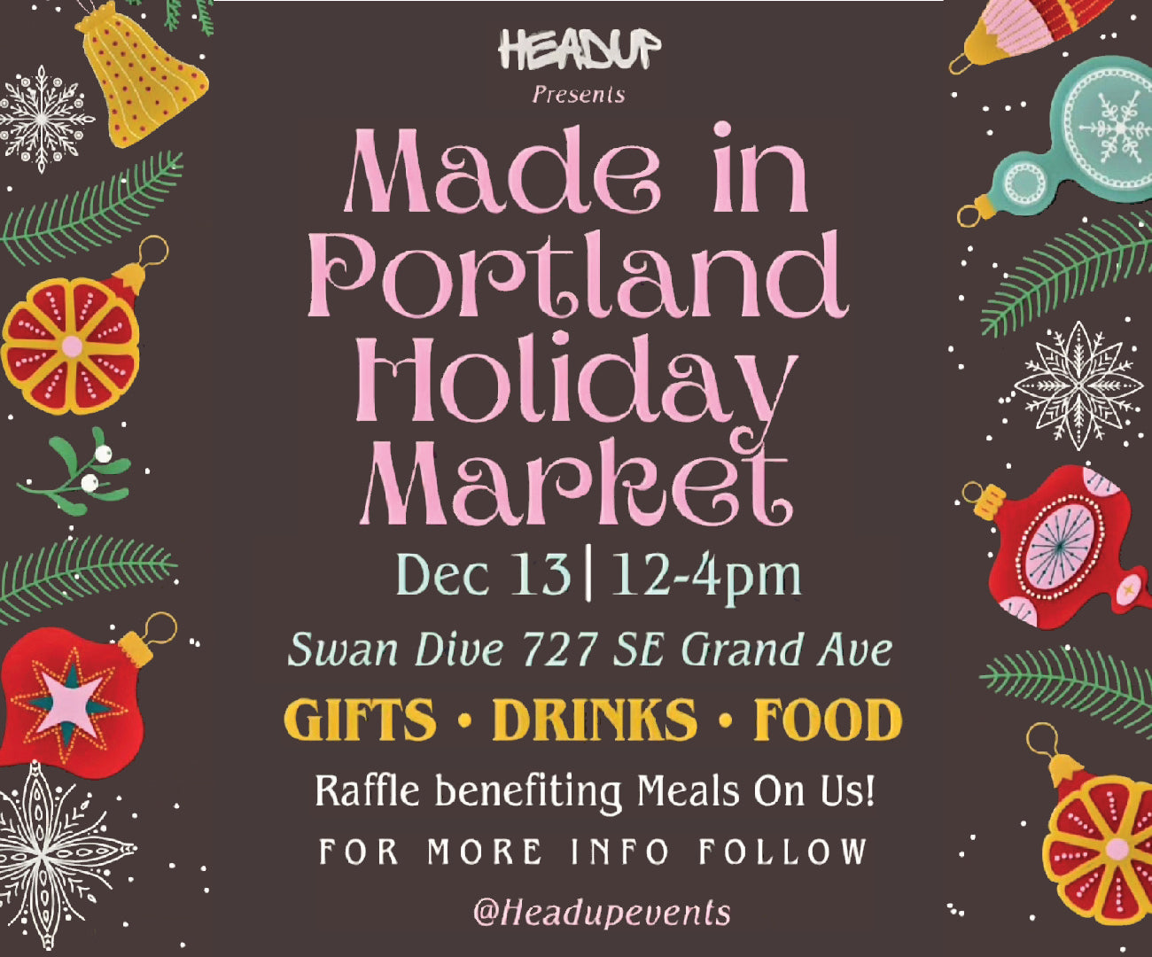 Join us this Dec. 13th at Swan Dive (727 se Grand Ave) from 12–4pm for a festive day of gifts, drinks & food! entry is free, but don’t forget to grab your raffle ticket benefiting Meals On Us Pdx