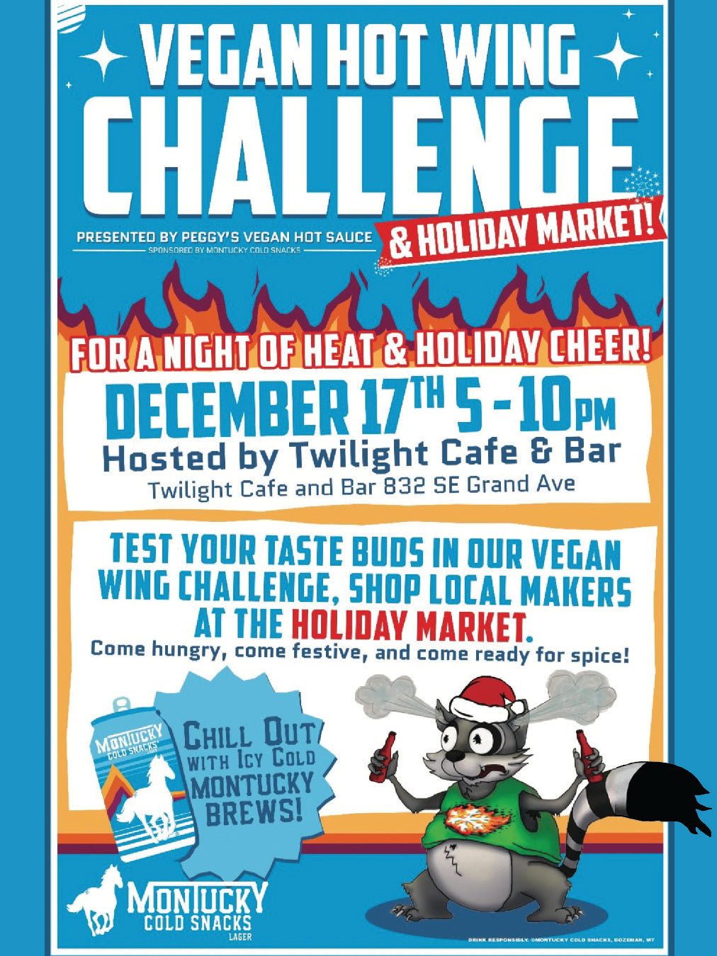 warm up your winter with the Hot Wing Challenge & Holiday Market Twilight Cafe & Bar on Dec. 17th from 5-10pm, presented by Peggy's Vegan Hot Sauce