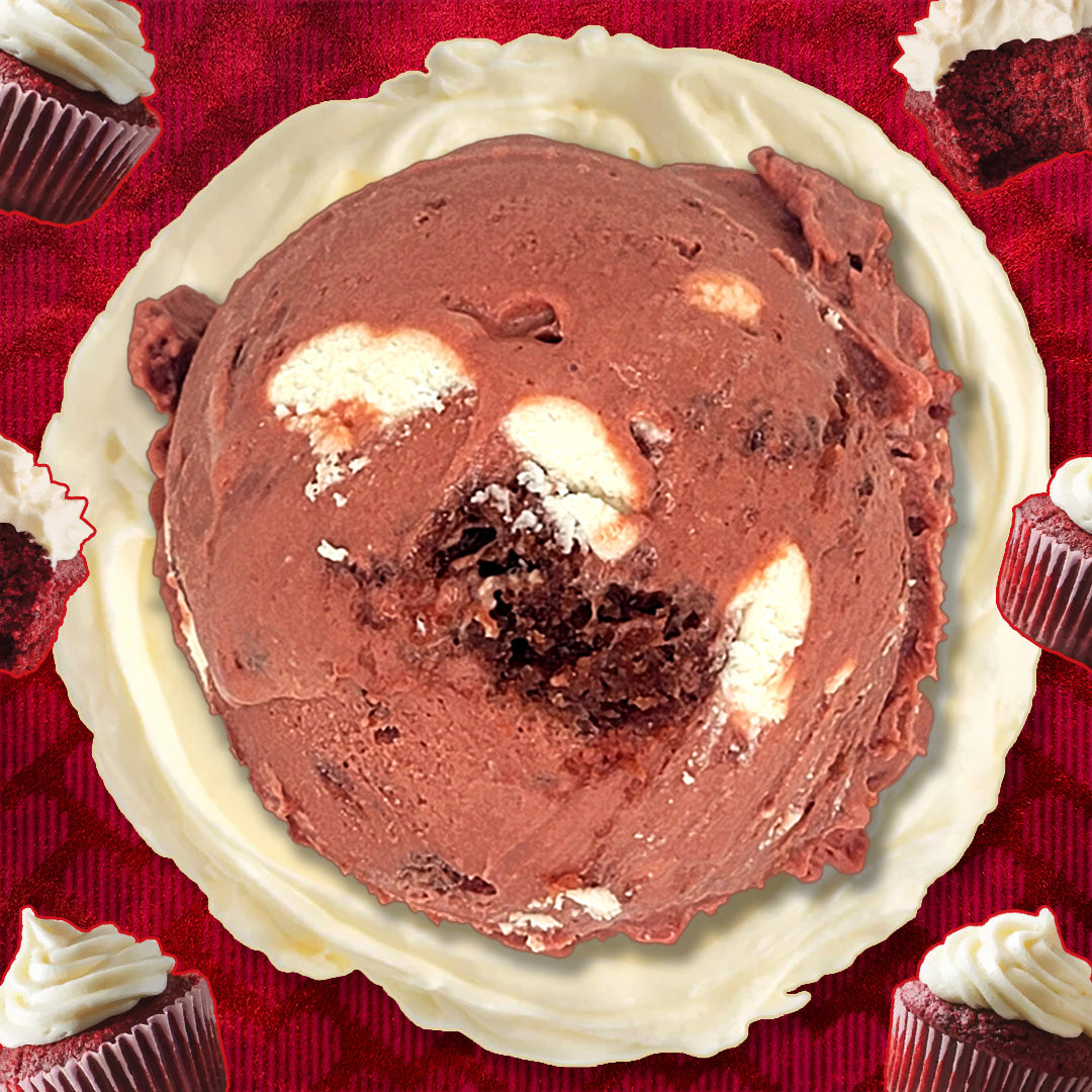tangy red velvet gelato folded with moist gluten-free red velvet cake, swirled with rich cream cheese frosting. decadent, delightful creamy, and definitely delicious.