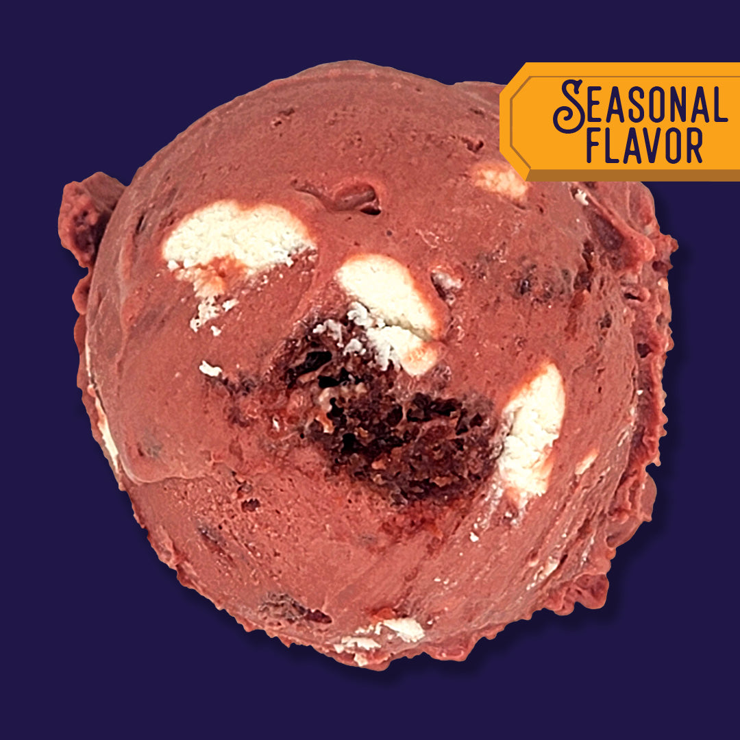 tangy cocoa and vanilla red velvet gelato folded with moist red velvet cake, swirled with rich cream cheese frosting. decadent, delightful creamy, and definitely delicious!